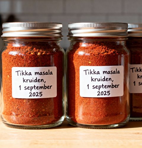 Schrijf op een etiket wat voor kruidenmix erin zit en de datum waarop je deze hebt gemaakt. Zo kun je bijhouden hoe lang de mix houdbaar is.