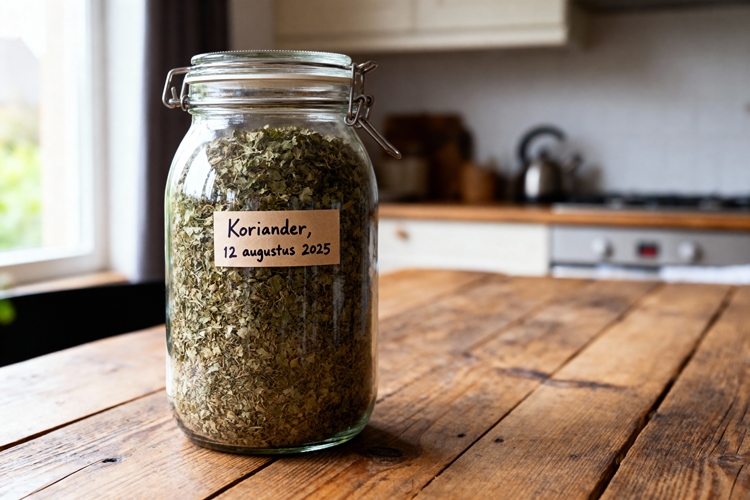 Als je koriander goed droogt en bewaart in een luchtdichte pot, liefst donker en op kamertemperatuur, dan is het wel een jaar houdbaar. Let op dat er geen vocht meer in de bladeren zit als je ze afsluit, anders kan schimmel alsnog ontstaan. Een goed gesloten pot in een keukenkastje doet wonderen.