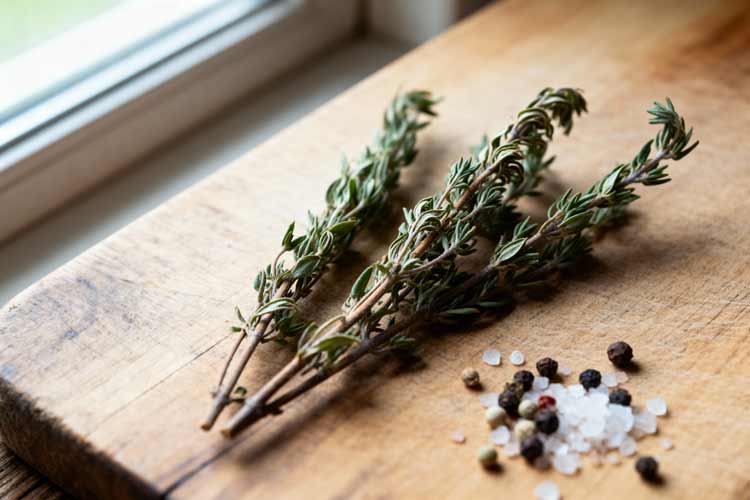 Meng de gedroogde tijm met grof zeezout om een heerlijk kruidenzout te maken voor vlees, vis of groenten.