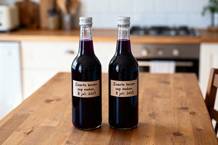 Met dit recept maak je ongeveer twee flessen zwarte bessen sap, helemaal vers en naar eigen smaak. Het proces is eenvoudig, maar vergt wat geduld. Door de bessen goed te laten pruttelen en het sap rustig uit te laten lekken, krijg je een geconcentreerde en smaakvolle drank. Wil je het sap langer bewaren, dan kun je het inmaken, waarbij je ook de keuze hebt om de flessen op de kop te zetten voor een betere afdichting. Let er wel op dat sommige deksels niet tegen het zuur kunnen, dus gebruik geschikte deksels als je deze methode wilt toepassen.