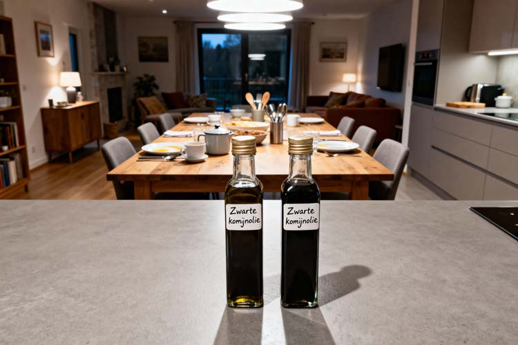 Zwarte komijnolie kun je redelijk lang bewaren, vooral wanneer je werkt met schone flesjes en de olie donker en koel staat. De kwaliteit blijft het best wanneer de fles niet telkens in fel licht of vlak bij een warmtebron staat. Na opening merk je dat de geur na verloop van tijd iets afneemt, maar de olie blijft nog goed te gebruiken zolang de smaak fris en nootachtig is. De houdbaarheid is vooral afhankelijk van de basiskwaliteit van de olie die je gebruikt en of er geen vocht in de fles is gekomen tijdens het bottelen. Zelfgemaakte olie bevat geen toevoegingen en is daardoor korter houdbaar dan commerciële varianten.